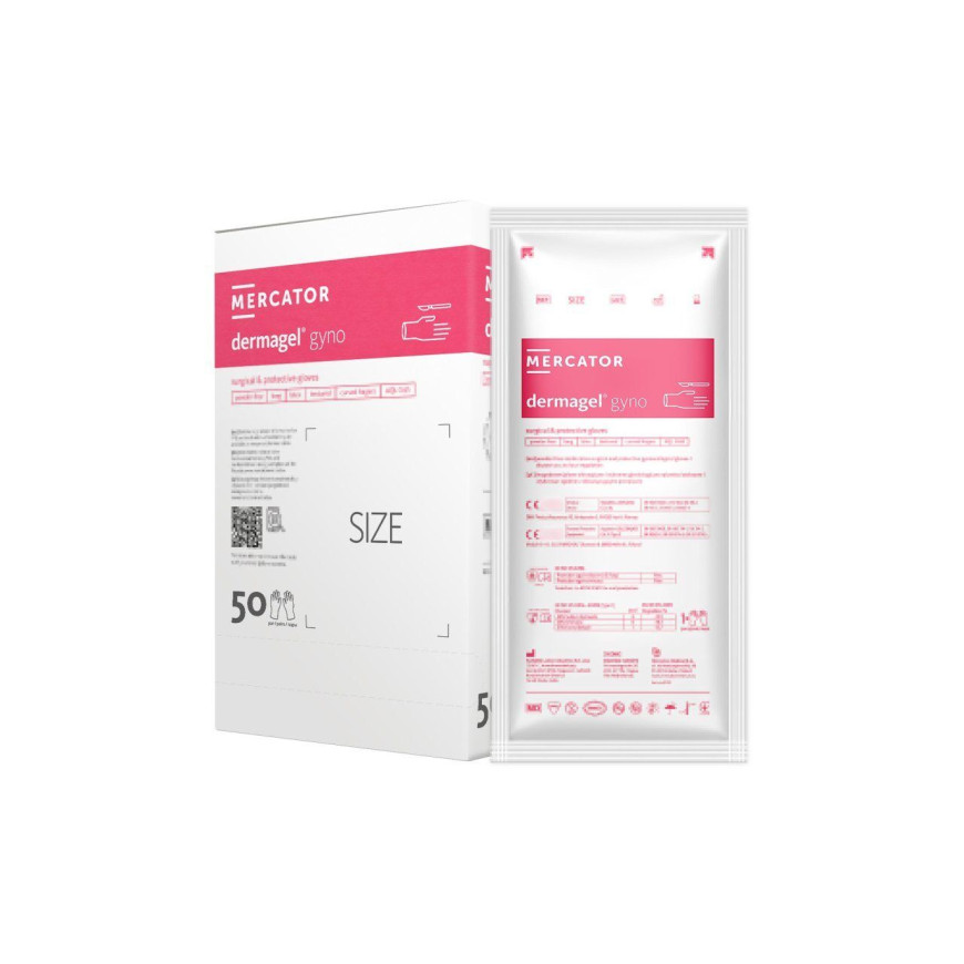 Dermagel gyno – хірургічні рукавички для гінекологічних процедур, виготовлені з натурального латексу, текстуровані, неопудрені, з подовженою манжетою (480 мм). Потовщені стінки збільшують стійкість до розриву.